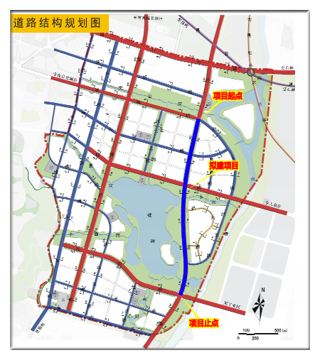 線路走向:道路線形走向?yàn)槟媳毕?,起于請遠(yuǎn)街與經(jīng)五路交叉口處,南止于經(jīng)三路南段與緯四路交叉口處,全長2276.21m。