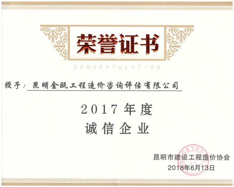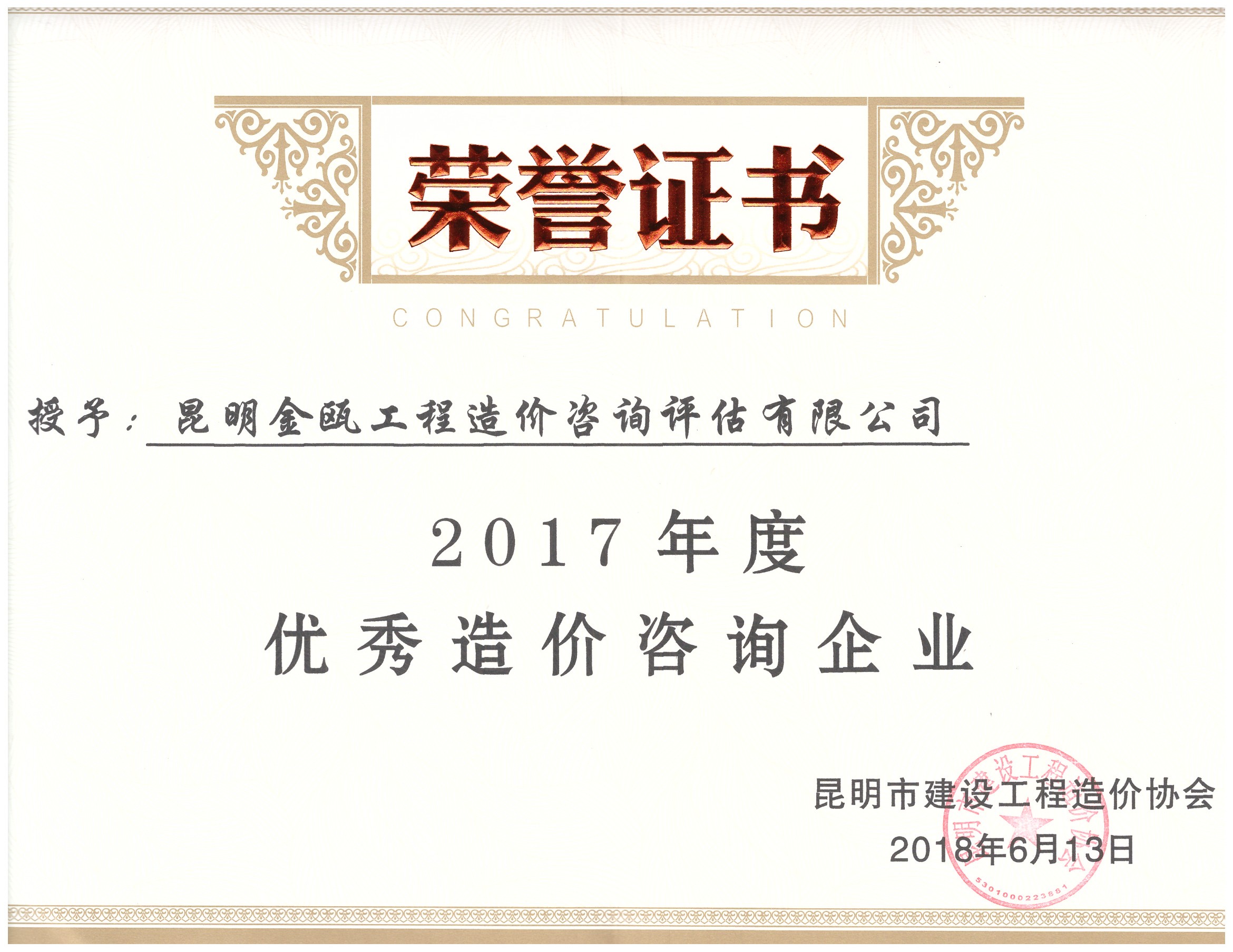 熱烈祝賀昆明金甌工程造價咨詢評估有限公司榮獲昆明市建設(shè)工程造價協(xié)會
