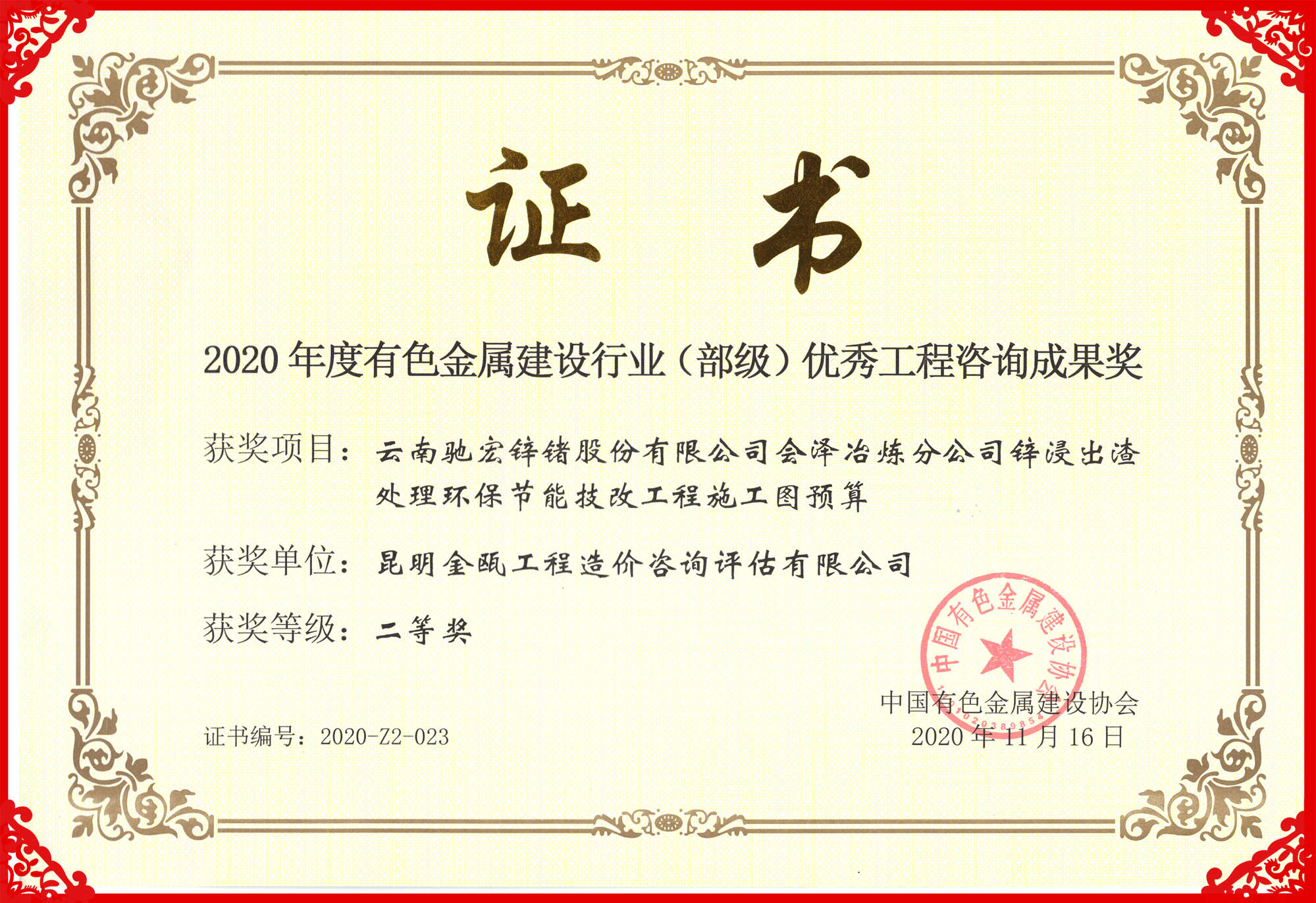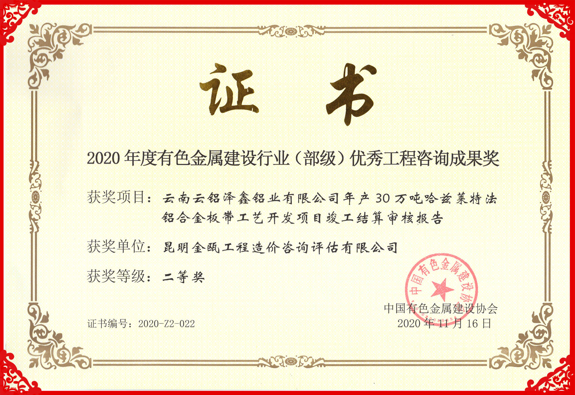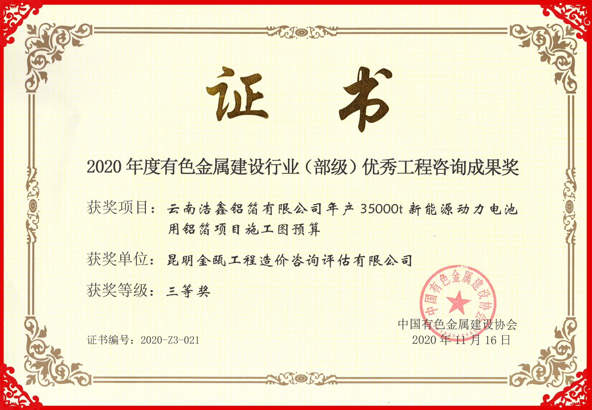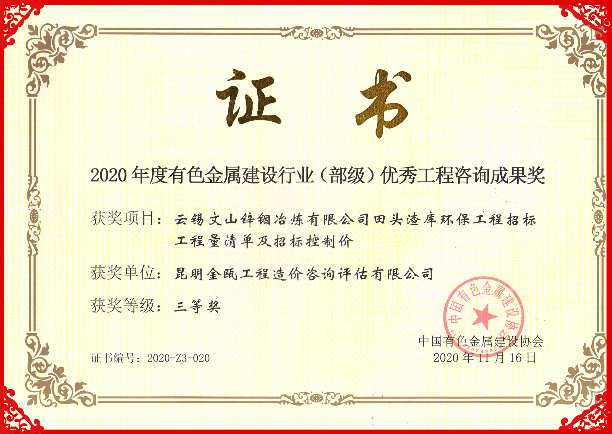 熱烈祝賀昆明金甌工程造價咨詢評估有限公司在2020年度中國有色金屬建設(shè)行業(yè)咨詢成果評獎活動中3個項目獲二等獎,3個項目獲三等獎