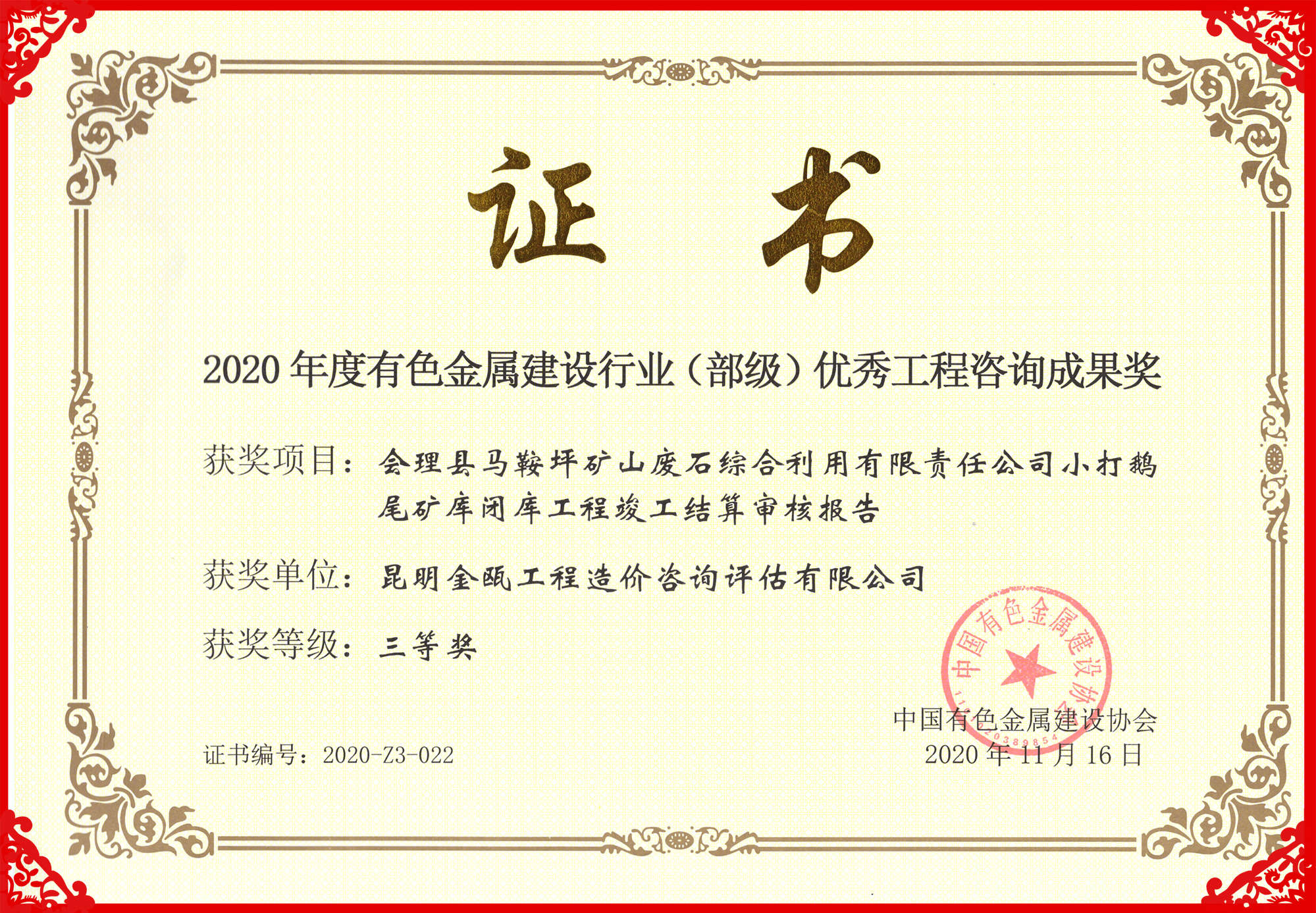 熱烈祝賀昆明金甌工程造價咨詢評估有限公司在2020年度中國有色金屬建設(shè)行業(yè)咨詢成果評獎活動中