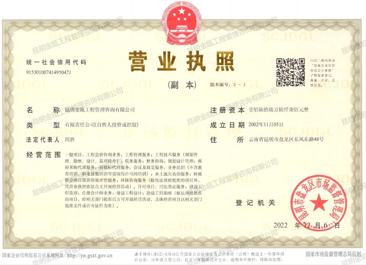 昆明金甌工程管理咨詢有限公司最新版營業(yè)執(zhí)照